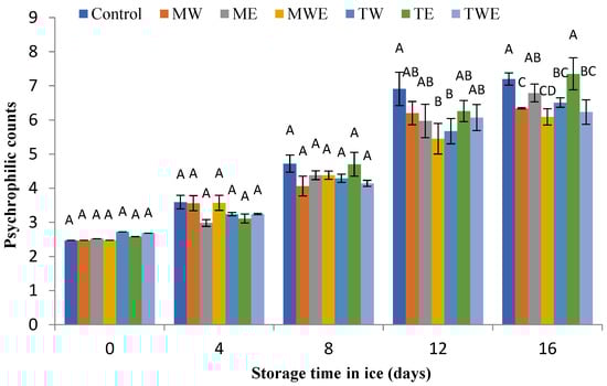 Psychrophilic bacterial counts play a relevant role in the deterioration of fresh fish and shellfish []. Figure 7 displays the changes obtained in psychrophilic bacteria counts for the Control and alga-treated fish during the present 16-day storage in ice. A progressive count increase in all batches was detected with the chilling time, so that a similar growth pattern was observed to that of aerobic bacteria. The initial count of psychrophilic bacteria ranged from 2.47 to 2.58 log CFU·g−1. No significant differences (p > 0.05) were detected among batches for the 0–8-day period. Then, most alga-treated samples revealed lower average values than those corresponding to the Control condition; the differences were found to be significant (p < 0.05) in fish corresponding to the aqueous extract of C. myrica (day 16), the aqueous extract of C. trinodis (days 12 and 16), the aqueous ethanol extract of C. myrica (days 12 and 16), and the aqueous–ethanolic extract of C. trinodis (day 16).