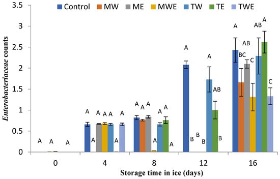 Figure 8 displays the changes in Enterobacteriaceae bacteria counts in rainbow trout samples during storage in ice. Up to 8 days of storage, the Enterobacteriaceae counts in the Control treatment and groups containing extracts of both algae were not different (p > 0.05). However, for the 12–16-day period, the counts in Control fish showed higher average values than most alga-treated samples; the differences were significant (p < 0.05) in fish subjected to aqueous extracts of C. myrica (days 12 and 16) and in aqueous ethanol extracts of C. myrica (days 12 and 16) and C. trinodis (days 12 and 16).