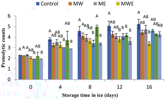 In the present study, the count evolution of microorganisms with a proteolytic phenotype is depicted in Figure 9. The results of this bacterial group showed similarities with the above-mentioned aerobe and psychrophilic count evolutions, which showed progressive increases with the storage time. Compared to the Control samples, lower values (p < 0.05) were detected in the 0–12-day period in fish corresponding to batches including water and water–ethanol extracts of C. trinodis. Additionally, the presence of aqueous–ethanolic extracts of C. myrica in the icing system led to lower levels (p < 0.05) than in Control samples in the 12–16-day period.