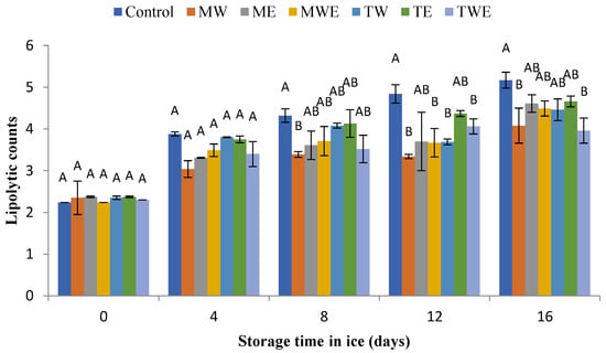 Determination of lipolytic counts (log CFU·g−1 muscle) in rainbow trout subjected to different icing systems. Average values of three (n = 3) replicates; standard deviations are indicated with bars. Average values with different letters (A,B) indicate significant (p < 0.05) differences. Icing systems are as expressed in Figure 1.