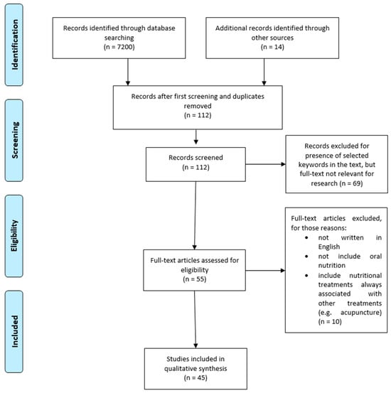 A total of 45 studies were included in the qualitative synthesis after the rigorous screening of 112 full-text articles, with exclusions primarily due to language limitations, the absence of oral nutrition interventions, or studies combining nutritional treatments with non-nutritional approaches. The included studies encompass randomized controlled trials, comparative studies, and systematic reviews, providing robust evidence for evaluating the efficacy of various nutritional strategies in managing nausea and vomiting during pregnancy (NVP).