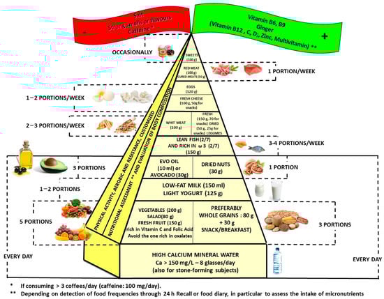 Foods with strong odors should be minimized across all food groups, including fish, white meat, and vegetables, as they can exacerbate nausea in women with increased olfactory sensitivity. This recommendation is distinct from portion guidelines, which aim to meet nutritional needs and ensure dietary adequacy. For example, red meats (100 g, 1 portion/week) and cured meats (50 g) are included in limited amounts primarily to mitigate the risks of cardiovascular disease and cancer associated with excessive consumption, rather than due to their odors. By separating these considerations, the pyramid ensures clarity in addressing both nutritional adequacy and practical management of nausea triggers.