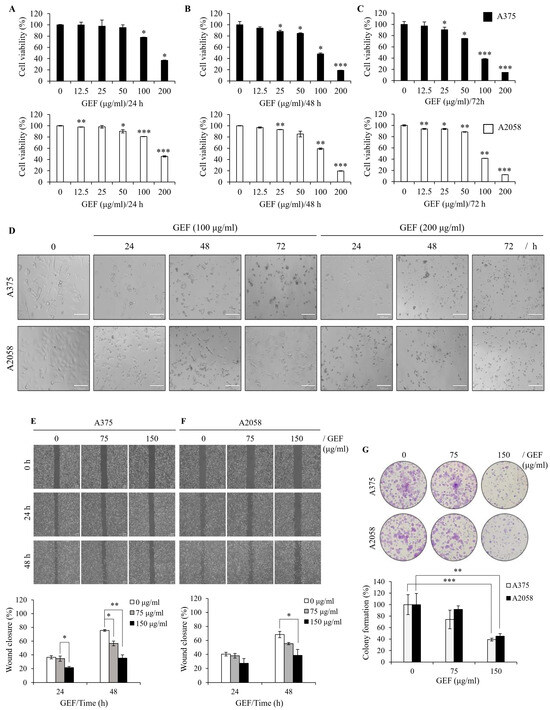 To examine the effect of GEF on melanoma cell survival, A375 and A2058 cells were treated with varying concentrations of GEF (0–200 μg/mL) for 24–72 h, and cell viability was measured using the WST-1 assay. Exposure to 0, 12.5, 25, 50, 100, and 200 μg/mL GEF induced a notable reduction in cell viability compared with that of the control group (Figure 1A–C), with survival rates of 14.5–90.5% for A375 cells and 12.4–93.6% for A2058 cells. Morphological changes, including increased cell death, were also evident in GEF-treated cells compared with those in the control group (Figure 1D). These findings indicate that GEF affects the viability of both melanoma cell lines.