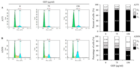 GEF induces G1 phase arrest in A375 cells and G2/M phase arrest in A2058 melanoma cells. The cells were treated with GEF (0, 75, and 150 μg/mL) for 24 h. The distribution of cells across different phases of the cell cycle was assessed after staining with PI and analyzed by flow cytometry. The histograms show the percentage of cells in each phase of for (A) A375 and (B) A2058. The data are representative of three independent experiments.