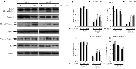 Altered expression of molecules related to apoptosis by GEF in melanoma cells. Cells were incubated with GEF (0, 75, and 150 μg/mL) for 48 h. (A) The effect of GEF on protein expression patterns of procaspase-9/-3, Bcl-2, and PARP was examined by Western blotting against β-actin as a loading control. (B) Protein expressions were quantified by ImageJ. The data are representative of three independent experiments. The data represent the mean ± SD of three independent experiments. * p < 0.05, ** p < 0.005, and *** p < 0.001.