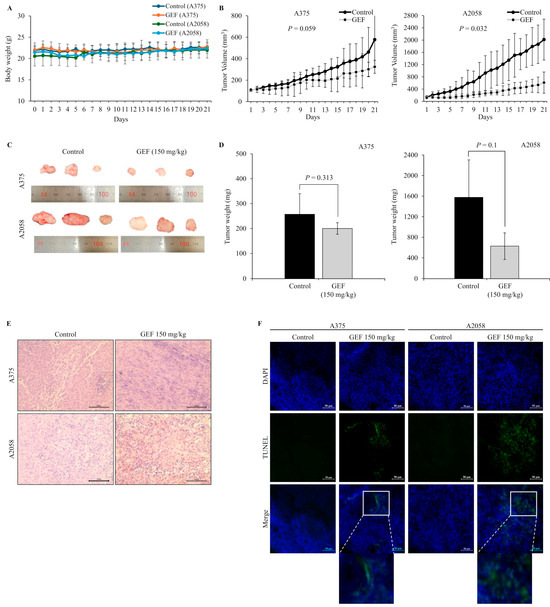 Tumor suppression by GEF in A375- and A2058-xenografted mice. A375- and A2058-xenografted nude mice received oral administration of either control or GEF (150 mg/kg). (A,B) Body weight and tumor volume were measured over three weeks. (C) At week 3, animals were euthanized, and tumors were excised. Representative images of the tumors are shown (for each group, n = 3). (D) Tumor weights were quantified, and the data are presented as the mean ± SD from three independent experiments, with significant differences denoted by p values. (E,F) Tumor tissue histological analysis was performed using H and E and DAPI/TUNEL staining. Scale bar = 50 μM.