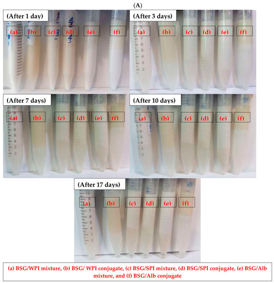 The ability of surfactants to form emulsion and to stabilize oil droplets after formation is quantified by EAI and ES, respectively [53,54]. An important techno-functional aspect of protein–polysaccharide conjugates is the improved interfacial properties induced by conjugation [55]. Generally, protein–polysaccharide conjugates have a higher ability than individual biopolymers or their mixtures to adsorb to the interface and to develop stable emulsions. Conjugation can also increase the solvation of hydrocolloids in the aqueous phase [56]. Emulsifying activity of conjugates depends on their ability to decrease the interfacial tension (IFT) between oil and water phases. IFT reduction is mediated by hydrophobic and hydrophilic moieties of conjugates toward oil and water, respectively. The EAI and turbidity of various protein/BSG mixtures and respective conjugates are shown in Figure 8. The EAIs of protein/BSG mixtures were significantly lower than those of their conjugated counterparts. In other words, the EAI in the mixture of WPI/BSG, SPI/BSG, and Alb/BSG increased from 12.94, 20.43, and 19.2 m2/g to 79.32, 24.89, and 55.37 m2/g, respectively. Polymerization during dry heat treatment plays an important role in the increase in emulsifying activity. Similarly to other emulsifiers, the adsorbed conjugates develop an interfacial film at the O/W interface, which is responsible for the emulsion stability. The type of protein had a significant effect on the ability of protein/BSG conjugates on emulsion stabilization. Emulsion samples prepared by different proteins/BSG mixtures and respective conjugates showed ES of 100% after 24 h of storage (Figure 9). After three days of storage, all proteins/BSG conjugates and the mixture of BSG with WPI revealed 100% stability. Water phase separation of around 27.7% and 38.3% was measured in the emulsion samples stabilized by SPI/BSG and Alb/BSG mixtures, respectively. Water phase separation at the bottom occurred in mixed and conjugated BSG-stabilized emulsions after 7 days of storage (Figure 9). The emulsion stabilized by the Alb/BSG conjugate revealed the lowest water phase separation. It was also homogenous, which indicated the Alb/BSG conjugate had the best emulsion stability properties. Lavaei et al. [57] studied the conjugation of gellan gum and soy protein by Maillard reaction. They reported that the conjugation increased the EAI and ES because of increasing protein solubility and improving the balance in the hydrophilic–hydrophobic character. Shen and Li [58] evaluated the functional properties of conjugated guar gum–pea protein isolate. The increase in the emulsion stability prepared by this conjugate was attributed to the formation of strong layer at the interface and thus improved steric stabilization.