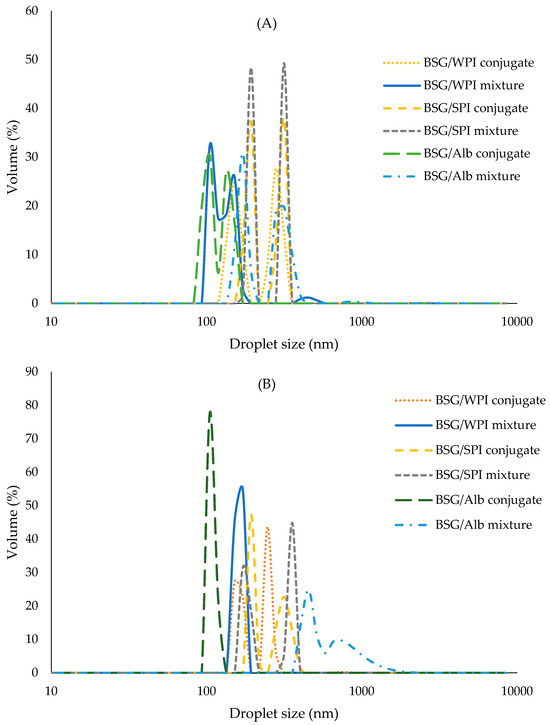 Protein/BSG mixtures or conjugates (0.075 g) were dispersed in double distilled water (DDW) (17.50 g) and hydrated at 25 °C for 24 h. After that, canola oil (7.50 g) was gradually added, and homogenized by Ultra-Turrax (T18, IKA, Staufen im Breisgau, Germany) at 15,000 rpm for 2 min, followed by sonication (SONOPULS, HD3200, Bandelin Co., Berlin, Germany) for 5 min at 150 W.