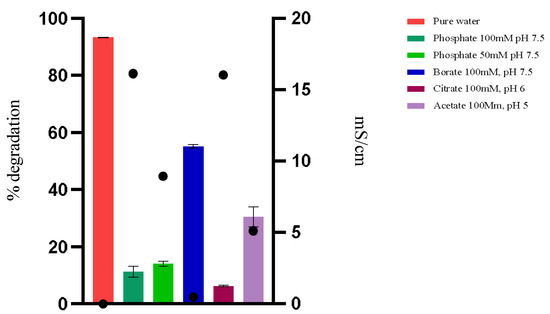 The hydrolysis of OTA by PPL in different buffers and ultra-pure water at 44 °C is represented by bars. The conductivity in mS/cm of each solution under study is represented by a black dot above each bar.