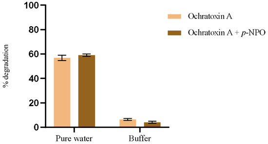 When conducting the competitive assay with both substrates present in the same solution, the results remain consistent, showing higher degradation of the model compound in buffer and OTA in water. This suggests that the interactions between the enzyme, OTA, and the model substrate are independent of each other and do not interfere with one another.