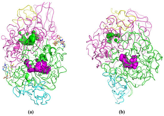 Cartoon representation of the last recorded conformation of PPL in water (a) and PBS (b), the cavities of the active centers are highlighted for chain A (magenta surface) and chain C (green surface). Both images are cropped depth-wise to aid visualization of the active center cavities.