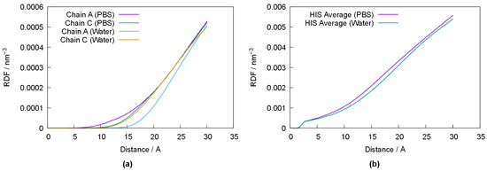 In order to better ascertain the impact of the varying conformation of PPL with respect to its media, Figure 6 depicts the radial-pair distribution function (RDF) of water’s oxygen atom (OW) relative to the average position of Ser156, Asp177 and His264 in chains A and C of PPL in both media (Figure 6a), as well as the RDF of OW relative to the average position of all histidines in chains A and C (Figure 6b). Despite some differences between chain A and C (which are likely the result of error propagation from small differences in the original crystallographic structure), the results depicted in Figure 6a show that the active centers are somewhat closer to the water–protein interface in PBS, and that solvation of PPL in pure water results in the active centers being pushed towards the inside of the enzyme. Indeed, this behavior is observed for all histidine residues, as shown in Figure 6b, suggesting a migration of the histidine residues towards the inner (more lipophilic) moiety of PPL when in water.