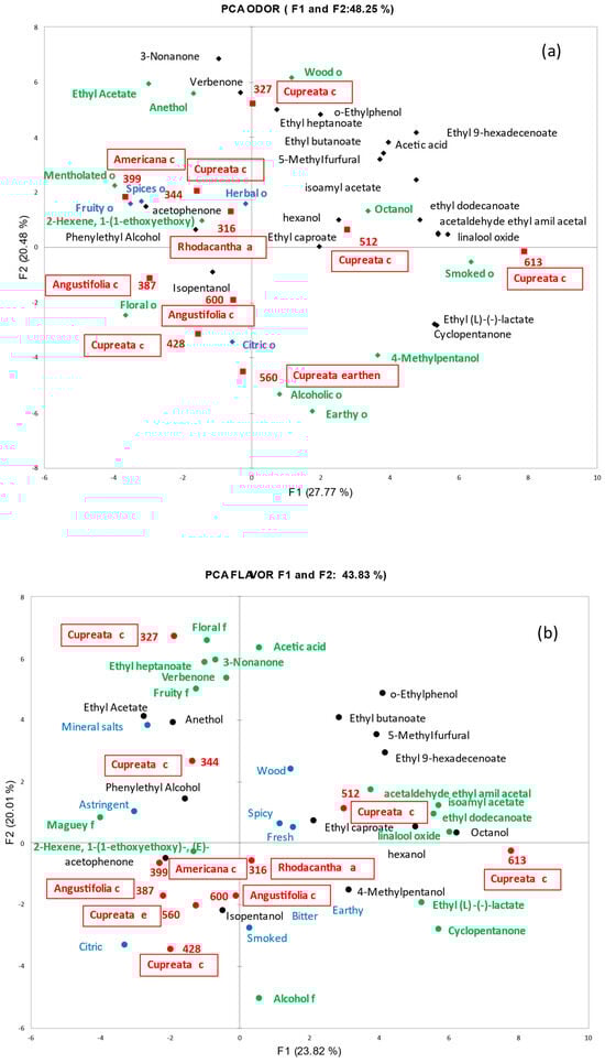 The visual relationship between Mezcal flavor descriptors and volatiles is presented in Figure 2b. It can be observed that most flavor attributes were associated with Mezcals of the Cupreata variety. In relation to the volatile compounds, most of them were associated with different samples of the Cupreata variety.