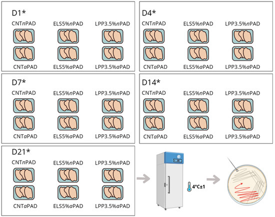 The aPAD (trade name: “Bacteria Catcher”) employed in this study was designed and supplied by ANT Advanced Nonwovens Technologies s.r.l., a company that is part of the Deatex group based in Milan, Italy. The aPAD used in this trial is identical to the one reported by Castrica et al. [37]. Briefly, the aPAD, measuring 7.5 × 13.5 cm, comprises two main components: an absorbent section, constructed from non-woven fabric and anchored to the base of the packaging, and an active section impregnated with an additive mixture. This mixture consists of 30–50% polymeric cationic agents by weight, 10–20% base by weight, and 1–10% auxiliary substances by weight.