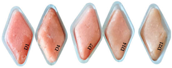 The slices were weighed before packaging and then reweighed at the established time to assess the water-holding capacity (WHC), determined by the loss of liquids during storage via the following equation: (W0 − WT1,4,7,14,21)/W0 × 100, where W0 = weight pre-packaging and WT = weight at different storage times.