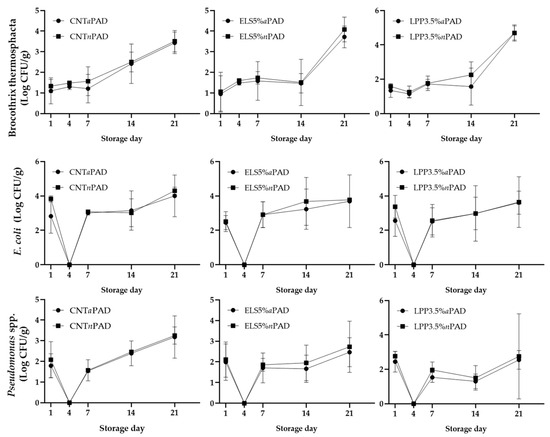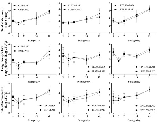 After 21 days of shelf life, the storage time had a significant effect on all evaluated microorganisms, with an overall increase in bacterial counts observed over time (p < 0.005). Moreover, significant differences at 21 days of storage were observed for coagulase-positive staphylococci, where the control group with the active PAD exhibited lower microbial loads compared to the CNT group with the nPAD (p < 0.001). Notably, the slowdown, likely due to the effect of the aPAD, was already evident by day 4 (Figure 3). A similar trend was observed for the total viable count, where the ELS5% aPAD group exhibited lower counts compared to the ELS5%nPAD group at day 21. This finding aligns with the observations reported by Cullere et al. [1], where the group fed a diet supplemented with flax exhibited a reduction in the total bacterial count.