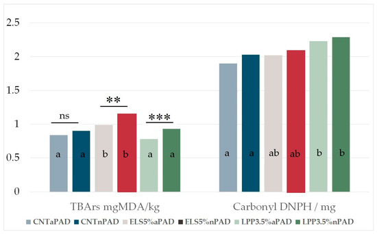 TBARS and the carbonyl group of rabbit meat affected by different diets and pads on average for different stored times. Significant differences between aPAD and nPAD inside the same feed group are indicated as ns: not significant, ** p < 0.01, and *** 0.001; different letters mean significant differences among (p < 0.05) the means of the diets.