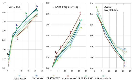 Trend of water-holding capacity (WHC). TBARS and overall acceptability across the storage times. Different letters at the same time mean significant differences for p < 0.05; the color of the letter corresponds to the color of the group; the group without letters is in the intermediate position.