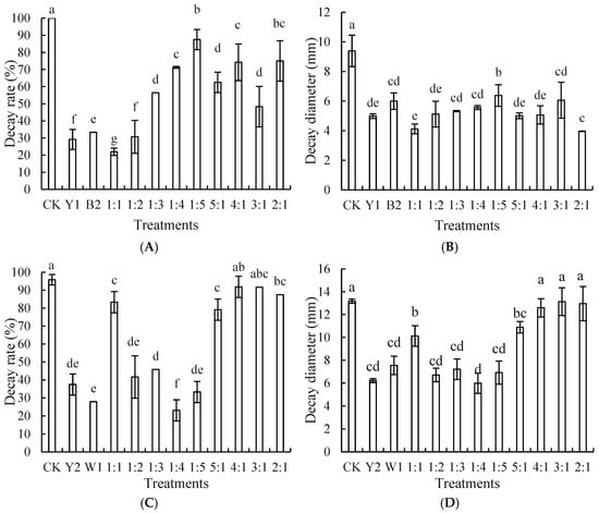 Effects of non-volatile metabolites produced by different treatments on blue mold (A,B) and black mold (C,D) of red grapes. Note: CK is sterile water control group; Y1, Y2, B2, B4, and W3 represent different treatment groups. Different letters represent significant differences (p < 0.05) according to Duncan’s multiple-range mean comparison test.