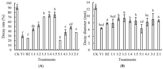 Similarly to the effect on blue mold, antagonistic yeast Y1 and bacterium B2 were initially used for compounding, as shown in Figure 3A. The best control of A. niger was achieved when the ratio of Y1 to B2 was 5:1, featuring a pronounced decrease in decay rate compared to all other groups after five days of storage. At this time, the control group experienced a complete decay rate, reaching 100%, and the decay diameter was smaller in the 5:1 ratio treatment group, as shown in Figure 3B. Therefore, we selected the 5:1 ratio of Y1 to B2, designated as Q1.