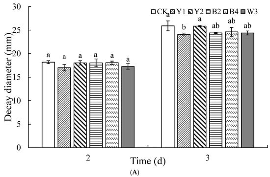 The treatment of red grapes followed the same procedure as in Section 2.1, and the preparation of the antagonist supernatant was also as described in Section 2.7.1. Then, 10 μL of the supernatants from Y1, Y2, B2, B4, and W3 were applied to the grapes. The control condition was established with sterile water. After 2 h to dry, 10 μL of 1 × 105 CFU/mL spore suspensions of P. expansum and A. niger were inoculated. The fruits were then dried again, packed in plastic baskets, wrapped in plastic, and stored at 25 °C with 95% humidity. The decay rate and diameter were measured after 3 days of storage, with 3 replicates and 24 fruits per group.