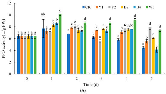 As shown in Figure 11A, the PPO activities of the composite microbial group W3 were all significantly higher than those of the control group and the remaining four groups of single antagonist treatment groups in the first 4 days (p < 0.05). Moreover, on the first day, PPO activities peaked in both the control group and the composite treatment group W3, with the latter showing a PPO activity of 10.13 U/g FW, which was 1.32 times greater than the 7.7 U/g FW observed in the control group. Overall, the PPO activities across the four single antagonist treatments exhibited a pattern of initial increase followed by a decline. Throughout most of the storage duration, these activities were surpassed by those in the composite treatment group but exceeded the levels found in the control group.