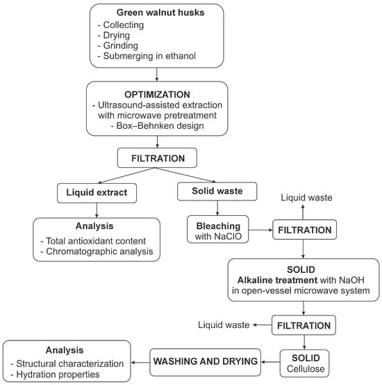 The ultrasound-assisted extraction process with microwave pretreatment was modeled and optimized to maximize the yield of antioxidants from green walnut husks using a response surface methodology with Box–Behnken design. In this design, the ultrasound-assisted extraction time (10–40 min), ultrasound-assisted extraction temperature (40–60 °C), and microwave pretreatment time (20–60 s) were selected as the factors, while the total antioxidant content was defined as the response. The solvent of choice for extracting antioxidants was 50% (v/v) ethanol. After optimization using the desirability function, an ultrasound-assisted extraction time of 23 min, ultrasound-assisted extraction temperature of 60 °C, and microwave pretreatment time of 60 s were proposed as the optimal conditions and their validity was verified. Under these conditions, the experimentally determined total antioxidant content was 3.69 g of gallic acid equivalent per 100 g of dry matter. In addition to phenolics, UHPLC–ESI–MS/MS analysis indicated the presence of lipids, quinones, terpenoids, and organic acids in the extract. After the antioxidant extraction, the solid residue was further processed to isolate cellulose in line with the concept of sustainable manufacturing. The structural characterization and hydration properties of cellulose were analyzed to identify its key features and assess its potential for value-added applications. The results demonstrate that green walnut husks are a valuable and cost-effective agro-industrial byproduct for extracting antioxidants and isolating cellulose. This aligns with the principles of a circular economy and the sustainable production of natural compounds.