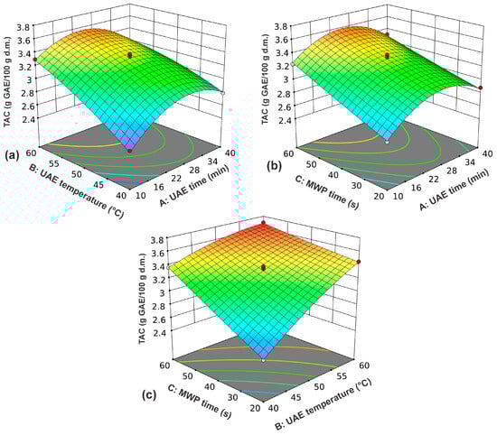 where Y is the TAC; X1 is the UAE time, X2 is the UAE temperature; and X3 is the MWP time. The positive coefficients in the polynomial equation led to an increase in TAC with increasing factor levels and vice versa. A higher value of the regression coefficient indicated a greater influence of the extraction parameter on the defined response. The analysis of linear terms suggested that all extraction parameters positively influence the TAC. UAE temperature had the greatest impact of all analyzed factors, followed by MWP time and UAE time. The influence of UAE time was many times smaller than that of the other two extraction parameters.