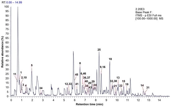 The base peak chromatogram of green walnut husk extract obtained under optimal conditions for antioxidant extraction. The peak number corresponds to the detected compound, as listed in Table 5. NL—normalization level; ITMS—c; ESIA—ion trap mass spectrometry combined with electrospray ionization.