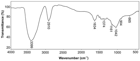 In Figure 5, the FT-IR spectrum of isolated cellulose from solid residue after the extraction of antioxidants from green walnut husks is presented. The band at 3339 cm−1 originated from the valence vibration of the –OH group, while the bands at 2910 cm−1 and 1374 cm−1 were the result of the valence vibration of the C–H bond of glucose. The vibrations of water absorbed in cellulose gave the a at 1634 cm−1 [23], while the valence vibration of the C–O–C bond produced a band at 1161 cm−1. The deformation vibration of the –CH2 group and C–H bond was noted at 1431 cm−1 and 1375 cm−1, respectively. The band at 904 cm−1 was characteristic of the β-glycosidic bond between the glucose unit. This band, which corresponds to the amorphous region, is often used to identify cellulose in various biological and synthetic materials. The spectrum was in accordance with the cellulose commercial whose spectrum has described in the literature [63]. The spectrum of isolated cellulose was similar to that of commercial cellulose, with no new bands observed, but with slight variations in their intensity and position. This indicates that there were no changes in the functional groups, suggesting that they were not chemically modified during the isolation process. The band originated from the valence vibration of the O–H group and was shifted to the lower wavelengths (3399 cm−1) compared to the commercial cellulose (3509 cm−1). It was probably due to the formation of intramolecular or intermolecular hydrogen bonds, conformation change, and interchain interactions in cellulose. The similar intensity of the bands at 898 cm−1 and 904 cm−1 in the spectra of commercial and isolated celluloses suggests the presence of the same amorphous region.