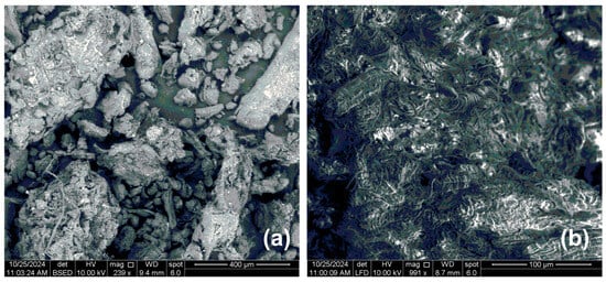 In Figure 6, the SEM images of native cellulose powder obtained by the different magnifications are presented. The cellulose surface at the magnification 239× is almost flat with spherical and cylindrical particles (Figure 6a). The porous structure and agglomerate of fibrous structure of cellulose powder can be noticed in the SEM image with magnification 991× presented in Figure 6b. Bhandari et al. [65] and Prasanna and Mitra [66] also confirmed using SEM analysis that native cellulose typically exhibits a fibrillar or fibrous morphology, depending on the source and isolation method. Uranchimeg et al. [67] showed that the morphology of cellulose significantly impacts the grinding process. The porous structure of isolated cellulose makes it highly effective for various filtration and separation processes, as well as for biomedical applications and composite material fabrication.