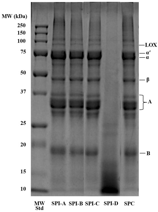 Figure 1. Reducing SDS-PAGE gel of soy protein powders. MW Std: molecular weight standard; SPI-A to -D: soy protein isolates A, B, C, and D; SPC: soy protein concentrate; LOX: lipoxygenases; α′, α, and β: subunits of β-conglycinin (7S); A and B: acidic subunit and basic subunit of glycinin (11S), respectively. (The SPI-C and SPI-D lanes were transposed horizontally from the original image for proper alignment.)