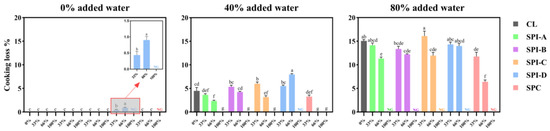 In the 0% added water system, the control (CL) and treatments with 33%, 66%, and 100% SPI-A to -C and SPC showed no cooking losses. The incorporation of SPI-D resulted in a subtle but statistically significant cooking loss (less than 1% w/w) at the 33% and 66% replacement levels and failed to form a self-supporting gel at 100%.
