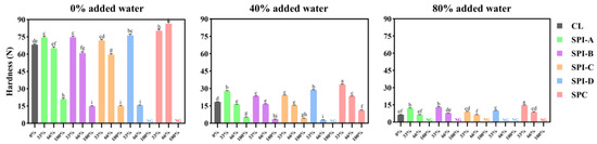 In the 0% added water batter system (Figure 3), at the 33% substitution level, all the soy proteins significantly increased hardness compared to the CL (68.3 N), with SPC resulting in the most pronounced increase (80.4 N). In contrast, Berry et al. [8] reported that replacing 20% of a ground beef patty with a soy protein isolate or concentrate (each hydrated to match beef protein content at 19%) resulted in lower shear forces than the all-beef patty. This discrepancy may stem from the different types of soy proteins used, the inherently greater toughness of beef than that of chicken and/or differences in meat particle size between the studied systems. When replacing 66% of the meat, SPI-A resulted in a hardness value comparable to the CL, whereas SPI-B to -D significantly reduced hardness; notably, SPI-D decreased hardness by over 75% compared to CL. Conversely, SPC resulted in the highest hardness among all the treatments at this level, reaching 86.5 N. At complete replacement, all SPIs, except for SPI-D (texture parameters not measurable), led to significantly reduced hardness (14–21 N) compared to the CL. On the other hand, SPC formed crumbles that were not cohesive enough to form gels that could be measured.