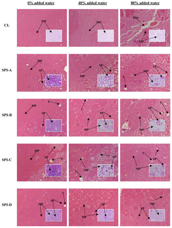 Figure 4. Hematoxylin–eosin-stained light micrographs of three cooked meat batter systems (0%, 40%, and 80% added water) with 33% meat replacement by soy proteins. Periodic acid–Schiff-stained sections are embedded into hematoxylin–eosin images. CL: control; SPI-A to -D: soy protein isolates A, B, C, and D; SPC: soy protein concentrate; Dsic: disconnection; V: void; MP: meat protein. Bar = 200 μm. Magnification: 10×.