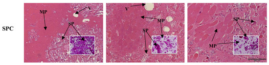 Figure 4 shows light micrographs of three lean meat batters (0%, 40%, and 80% added water) containing 33% hydrated soy proteins. In the 0% system, the CL showed a compact matrix with minimal open structures, similar to our previous work [20]. In the soy protein treatments, air bubbles were occasionally entrapped within the meat matrix, which was likely due to increased viscosity as a result of soy protein additions [15]. SPI-A to -C and SPC formed larger aggregates containing some air bubbles, whereas SPI-D remained as smaller particles without forming aggregates. This observation is consistent with the molecular weight profile (Figure 1), which suggests that SPI-D was previously hydrolyzed. Additionally, the SPC aggregates had a more intense purple hue (i.e., retained more PAS stain) compared to those of the SPIs; this can be explained by its higher carbohydrate content.
