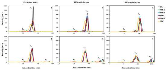 Figure 5. NMR T2 relaxation profiles of three lean meat batter systems (0%, 40%, and 80% added water) with 33% meat replacement by soy proteins. CL: meat control with 0% soy protein; SPI-A to -D: soy protein isolates A, B, C, and D; SPC: soy protein concentrate. Panels (a,d): raw and cooked batters with 0% added water; panels (b,e): 40% added water; panels (c,f): 80% added water. Each data point represents an average of at least three replications. T2b, T21, and T22: distinct T2 peak regions.