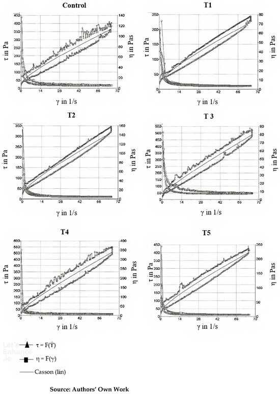As shown in Table 6 and Figure 1, thixotropy varied significantly between formulations (p ≤ 0.05), with values ranging from 2599 × 103 (Pa·s−1) to 7008 × 10−3 (Pa·s−1). Formulations T3, T4, and T5 had higher thixotropy values, suggesting that these formulations possess a more fragile structure and are more prone to viscosity reduction under constant shear stress, a characteristic that may be advantageous in coating and enrobing processes but less desirable in other types of processing, such as high-pressure molding.