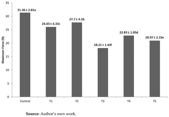 In the texture analysis, a maximum force (N) to break the samples was obtained, pointing to the hardness of the chocolates (Figure 2).