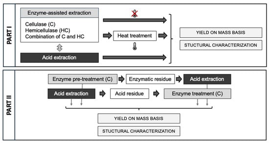 Current research can be subdivided into two parts. In the first part, the effect of different cell wall degrading enzymes, cellulase, hemicellulose, and a combination of both enzymes and the impact of the addition of heat treatment during the enzyme-assisted extraction (EAE) were investigated. In the second part, the most promising enzyme-assisted extraction process was combined with an acid extraction, either as an additional extraction step on the acid residue or as enzymatic pretreatment before the acid extraction.