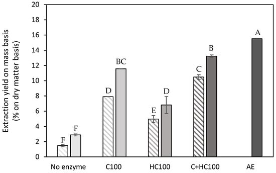 Extraction yield on a mass basis (% on dry matter basis) obtained after a control extraction (no enzyme) and the different enzyme-assisted extractions (cellulase (C), hemicellulase (HC), combination (C + HC)) without (shaded) and with (full) heat treatment of 5 min at 80 °C, in comparison to an acid extraction (AE) (dark grey). 100: concentration of 100 U/g for each enzyme. The error bars represent the standard deviation. A Tukey HSD test with p < 0.05 was used to evaluate whether differences in extraction yield on a mass basis were significant (different letters).