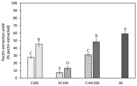 As the extraction yield on a mass basis (Figure 2) also includes the potential co-extraction of compounds other than pectin, it does not allow us to distinguish between the pectin and co-extracted polymers. Therefore, a structural characterization was performed for all extracted materials (except for the control extractions) to gain insight into the amount of pectin extracted. Therefore, the pectin extraction yield was calculated as described in Section 2.6, where the pectin extraction yield was defined as the percentage of pectin that was extracted during the extraction process of the total amount of pectin initially present in the biomass. The initial pectin content was determined on the AIR and was found to be 2.35 ± 0.06 g pectin per 100 g of wet carrot pomace (CP) and the dry matter content of this wet carrot pomace amounted to 12.1 ± 0.2% [29].