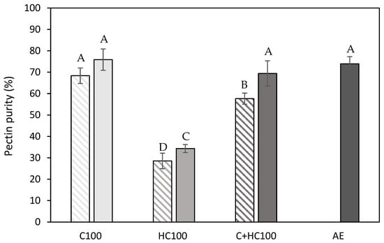 To gain more insight into the composition of the extracted materials, the results obtained in the structural characterization were used to determine the pectin purity as the sum of the different pectin-related monosaccharides (GalA, Gal, Ara, Rha, Xyl, and Fuc), all expressed in g per 100 g of the extracted material, and this purity is shown in Figure 4.