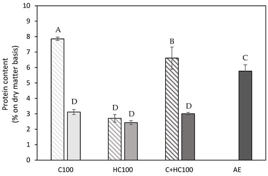 Protein content (% on dry matter basis) present in the extracts using the different enzyme-assisted extractions (cellulase (C), hemicellulase (HC), combination (C + HC)) without (shaded) and with (full) heat treatment of 5 min at 80 °C, in comparison to an acid extraction (AE) (dark grey). 100: concentration of 100 U/g for each enzyme. The error bars represent the standard deviation. A Tukey HSD test with p < 0.05 was used to evaluate whether differences in protein content were significant (different letters).