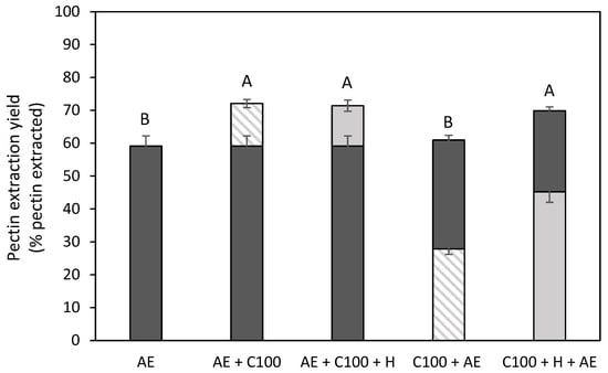 Pectin extraction yield (% pectin extracted) obtained after the different enzyme-assisted extractions (cellulase (C), hemicellulase (HC), combination (C + HC)) without (shaded) and with (full) heat treatment of 5 min at 80 °C, in comparison to an acid extraction (AE) (dark grey). 100: concentration of 100 U/g for each enzyme. The error bars represent the standard deviation. A 95% confidence interval was used to evaluate whether differences in pectin extraction yield were significant (different letters).