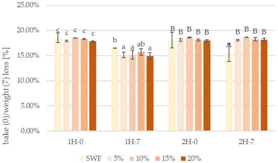 Bake loss of bread right after baking and after 7 days, SWF—soft wheat flour, 5–20%—pumpkin flour addition; 1H, 2H—proofing time; 0, 7—time points of measurement, 0—day of baking, 7—after 7 days respectively. Lowercase letters denote significant differences among 1 h proofed samples at p = 0.05; uppercase letters denote significant differences among 2 h proofed samples at p = 0.05.