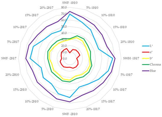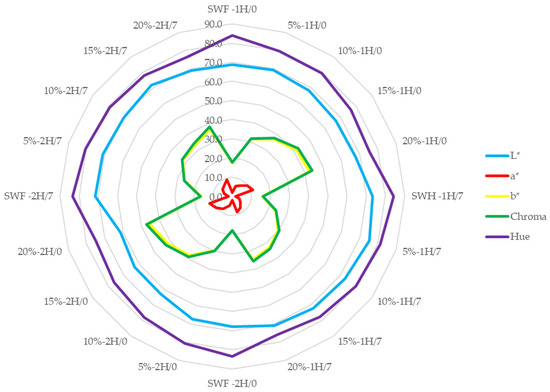 The chroma values (green line) follow a pattern similar to the b* values, suggesting that the yellowness component primarily influences the overall color intensity. This is particularly evident in samples with higher pumpkin flour concentrations. Batista et al. (2018) [60] demonstrated that replacing wheat flour with pumpkin seed flour maintained Chroma values despite significant L* reductions, confirming that pumpkin flour intensifies colour saturation.