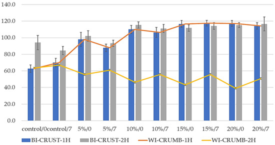In the one-hour fermentation group, the control bread exhibited the highest specific volume (2.25 ± 0.01 cm3/g) at day 0, which increased to 2.35 ± 0.03 cm3/g after 7 days. A gradual decrease in specific volume was observed with increasing pumpkin flour concentration, with the 20% enriched sample showing the lowest values (1.69 ± 0.03 cm3/g at day 0 and 1.80 ± 0.00 cm3/g at day 7). In the two-hour fermentation group, the control bread maintained the highest specific volume throughout the storage period, starting at 2.40 ± 0.01 cm3/g and slightly decreasing to 2.32 ± 0.00 cm3/g after 7 days. All pumpkin-enriched samples showed lower specific volumes than the control, following a similar declining trend with increasing pumpkin flour concentration. The 20% enriched sample again demonstrated the lowest specific volume values (1.69 ± 0.02 cm3/g at day 0 and 1.61 ± 0.00 cm3/g at day 7).