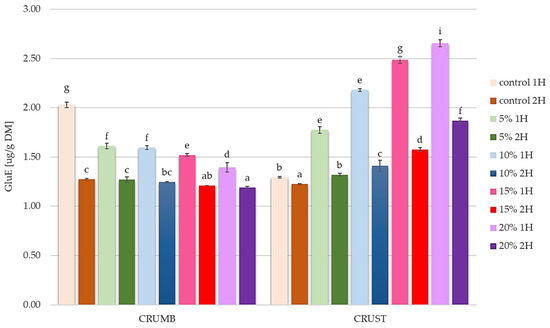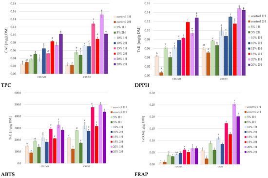 The crust and crumb of the baked bread were dried below 50 °C and then ground in a small laboratory grinder (Rommelsbacher EKM 100, ROMMELSBACHER ElektroHausgeräte GmbH, Dinkelsbühl, Germany). One gram of each bread from the crust and crumb (control, 5%, 10%, 15%, and 20%) was extracted with 5 mL of ethanol (99.99%) for the antioxidant activity (DPPH, ABTS, and FRAP) and total phenolic contents or with distilled water for reducing sugar contents. Samples were agitated for 1 h at 60 rpm on a radial stirrer (MX-RD PRO, ChemLand, Stargard, Poland), and then were centrifuged (15 min, 5000 rpm; MPW-350, MPW, Warsaw, Poland). After centrifugation, the supernatant was examined for total antioxidant potential (DPPH, ABTS), total reductive potential (FRAP), total polyphenol content (TPC), and reducing sugar content (Bernfeld method).
