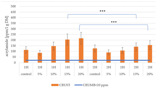Breads are the primary product of the cereal-based food category, which is the largest food group consumed. Because of its high consumption rate, bread is one of the main contributors to daily acrylamide intake in many countries. The bread’s high carbohydrate and protein content and the baking process make it susceptible to acrylamide formation. Several routes have been suggested for acrylamide formation in bread [8]. However, the quantity and ratio of precursors involved in acrylamide formation, the flour quality, application of enzymes, the processing methods (thermal and innovative), and processing conditions (type of fermentation, temperature, heating time, pH, water content and activity, and additives) may affect the formation of acrylamide [9]. The acrylamide formation is exceptionally typical for the bread crust, where the temperature reaches higher values during baking than in the bread crumb [10,11,12]. Hence, developing new concepts for acrylamide reduction in breads is necessary for food sectors and safeguarding human health. In general, the strategies to minimize the acrylamide formation in cereal products are focused on three main approaches: (a) elimination or replacement of precursor substrates, (b) modification of treatment conditions, and (c) elimination or reduction in acrylamide after formation [13].